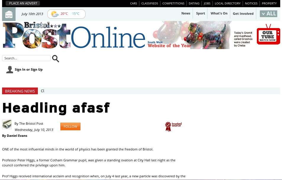 Below is a screenshot of the story in today’s Bristol Post reporting on Professor Peter Higgs – one of the team that postulated the existence of the particle named after him back in the 1960s – being granted the freedom of the city of Bristol.