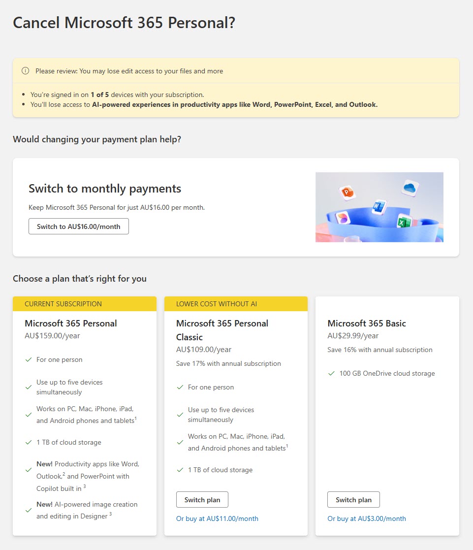 Microsoft’s communications with subscribers did not refer to the existence of the “Classic” plans without Copilot integration and the only way subscribers could access them was to begin the process of cancelling their subscriptions. This involved accessing the subscriptions section of their Microsoft account and selecting “Cancel subscription”. It was only on the following page that subscribers were given the option to move to the Classic plan instead.