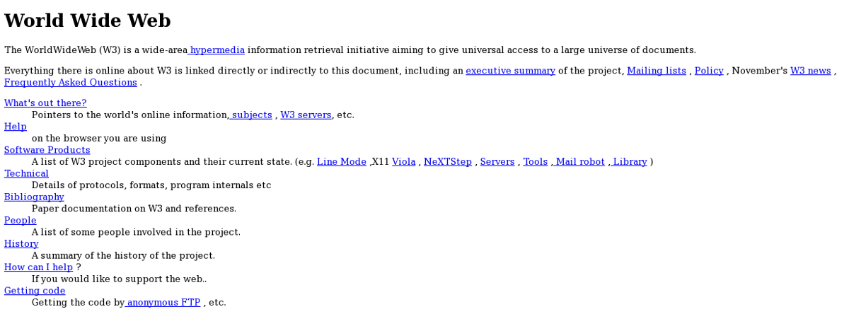 In honour of the 20th anniversary of the release of libwww into the public domain (posts passim), CERN has restored the first ever website at http://info.cern.ch/hypertext/WWW/TheProject.html